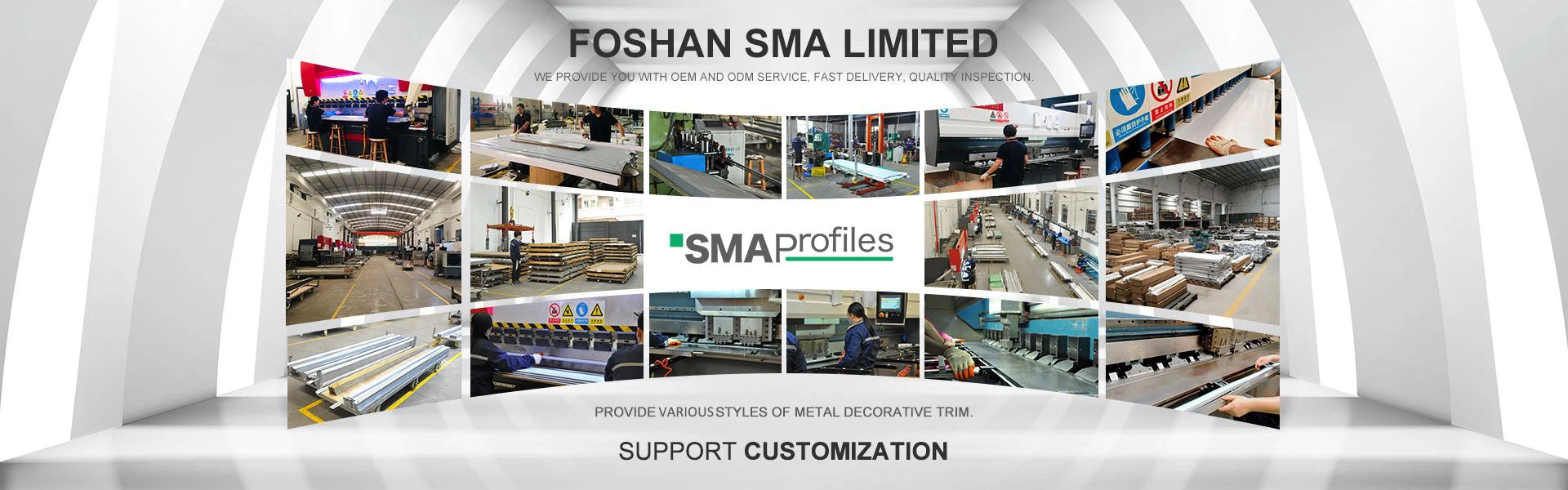 SMA je medzinárodne popredný výrobca hardvérových výrobkov, ktorý sa špecializuje na všetky typy profilov z nehrdzavejúcej ocele, hliníkové ozdobné lišty, okraje z pvc atď. Naša továreň má rozlohu asi 5 000 metrov štvorcových, viac ako 200 zamestnancov a moderné výrobné zariadenia. Máme 7 formovacích liniek na výrobu rôznych druhov líšt z nehrdzavejúcej ocele. V prípade hliníkových profilov ponúkame výrobnú linku typu všetko v jednom od návrhu formy, vytláčania hliníkových profilov, spracovania, povrchovej úpravy až po balenie. Týmto spôsobom sme mohli kontrolovať kvalitu z každého kroku. Po rokoch prevádzky sme nazhromaždili množstvo skúseností s výrobou a predajom a sme vynikajúci v kvalite a cene, aby sme nadviazali dobrý dlhodobý kooperačný vzťah s domácimi i zahraničnými distribútormi a technickými klientmi.